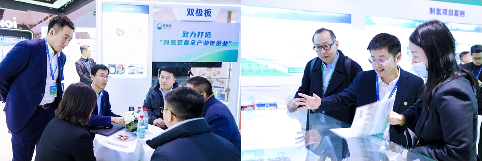 此次展会上,广东会碱性电解槽制氢成套系统、催化剂、双极板系列产品集体亮相,致力打造“氢能装备全产业链企业”,引众多国内外领导、行业专家和参观者驻足参观,并现场进行深入讨论交流。